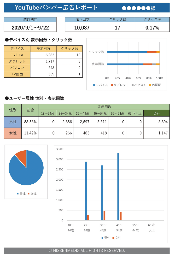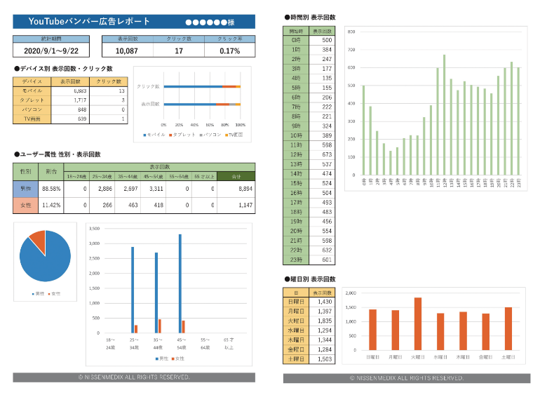 動画広告配信完了後(2ヵ月以上でのご契約の場合は1ヵ月ごと)に配信結果のレポートを作成いたします。どのように配信されたかを検証することで、次の広告戦略にも繋がります。